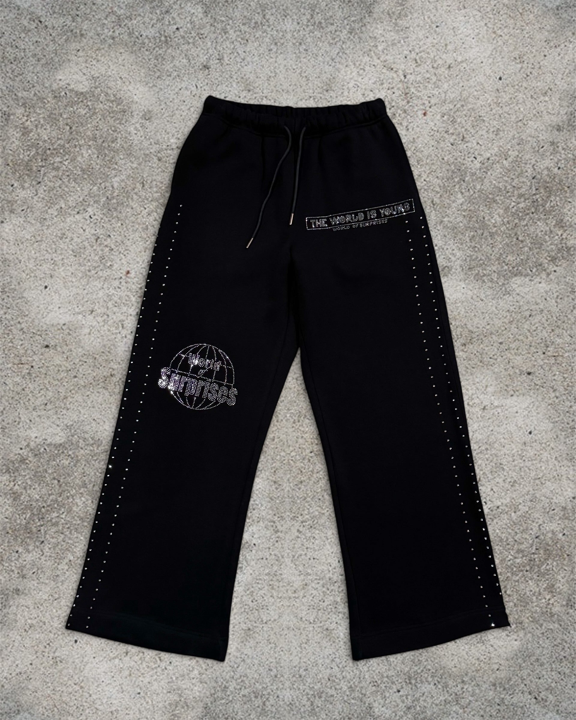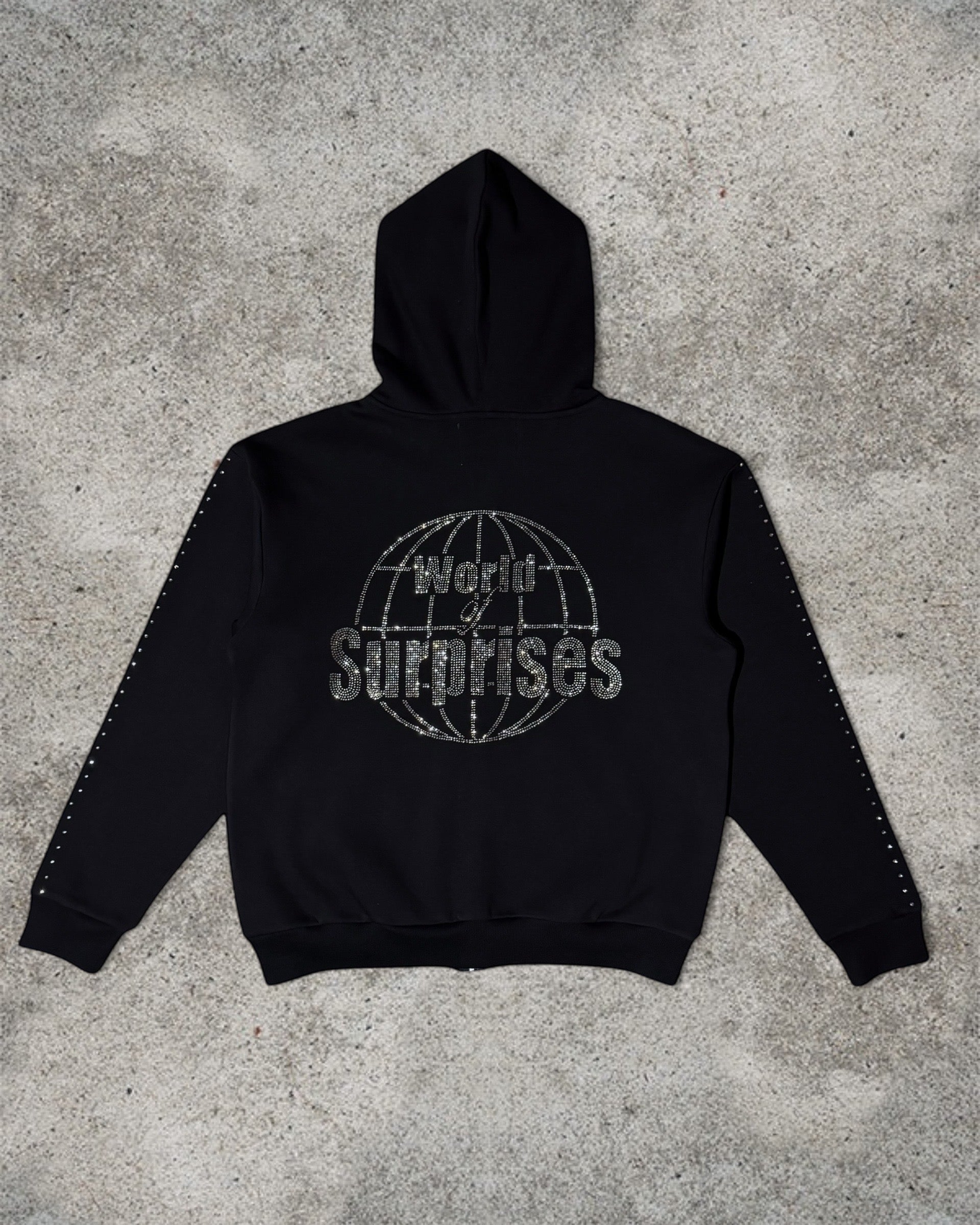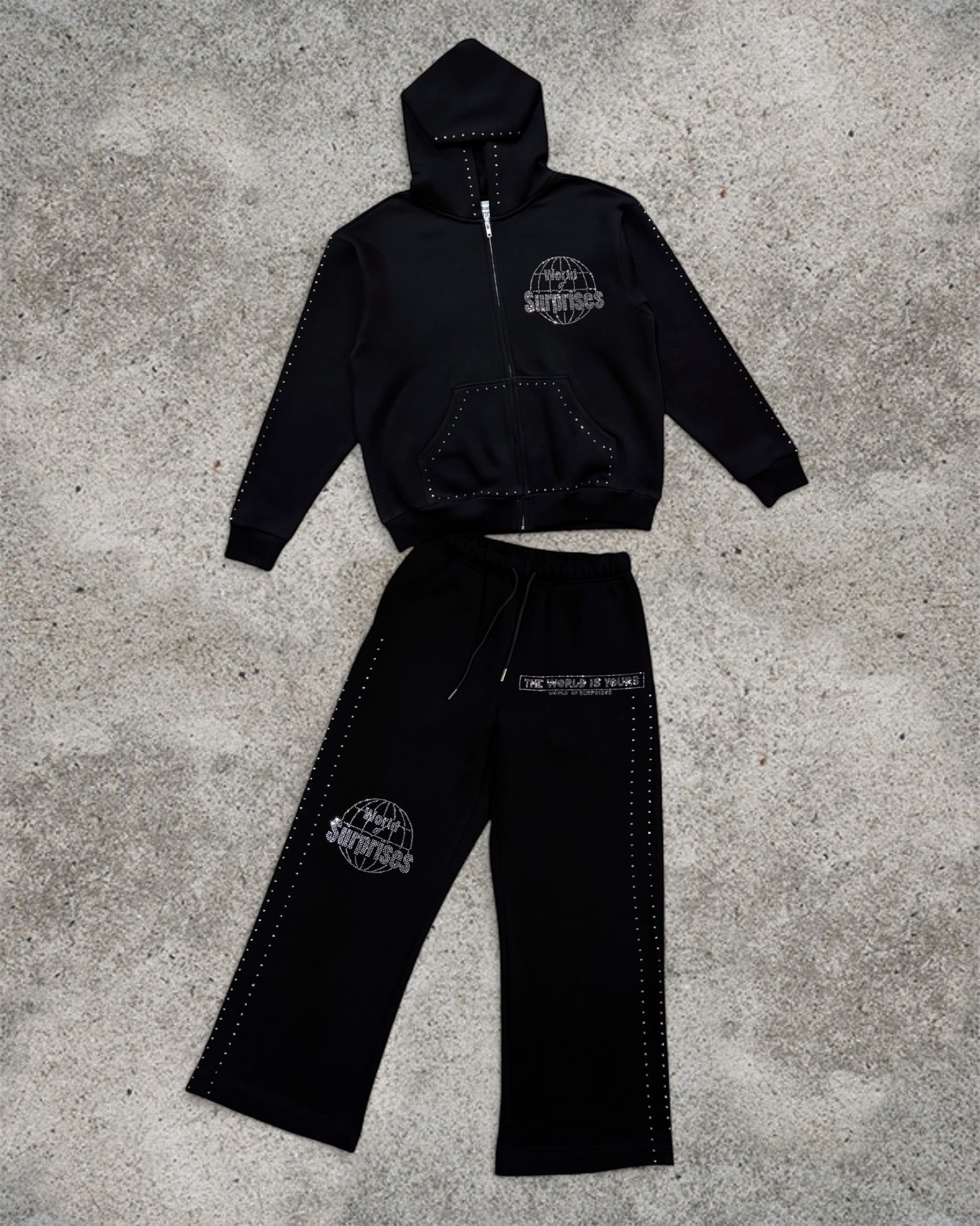 The all-black design is elevated with hand-set rhinestone embellishments tracing the seams and highlighting the signature World of Surprises globe logo — a symbol of ambition and global connection. The hoodie features a front zip closure and kangaroo pocket for everyday utility, while the matching wide-leg sweatpants balance comfort and edge with their relaxed silhouette and drawstring waistband.