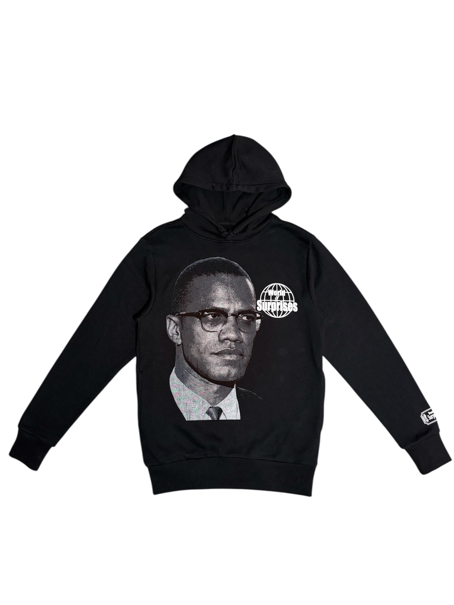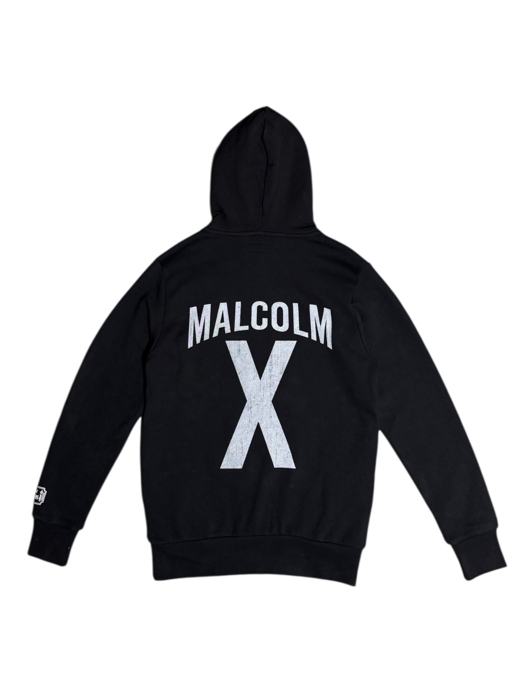 Crafted from a heavyweight premium cotton blend, the hoodie features a bold Malcolm X portrait on the front and a distressed “MALCOLM X” graphic across the back. The fit is structured yet comfortable, made for everyday wear with intention.